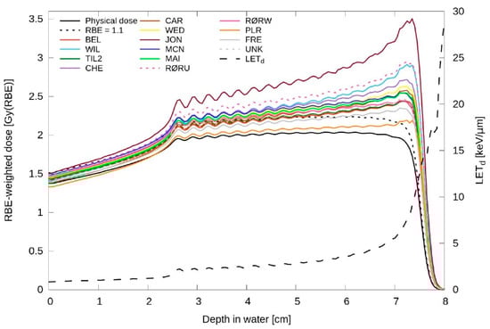 Biological dose estimations from various phenomenological RBE models from Rørvik et al. [61], Phys Med Biol 63 (18), 185,013 (2018). © Institute A physics and engineering in medicine, reproduced with the permission of IOP Publishing Ltd. BEL, CAR, CHE, FRE, JON, MAI, MCN, PLR, RØRU, RØRW, TIL2, UNK, WED, and WIL represent various phenomenological models included in the study. Please refer to Table 1 in [61] for details on each model. LETd, the dose-averaged linear energy transfer, is represented on the right axis. RBE indicates relative biological effectiveness.