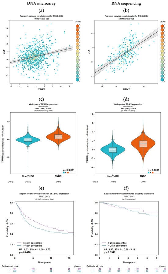 TRIM2 mRNA expression and patient outcome in triple-negative breast cancer using DNA microarray and RNA sequencing datasets within bc-GenExMiner: (a,b) correlation between TRIM2 and GLS mRNA expression, (c,d) TRIM2 mRNA according to triple-negative breast cancer status, (e,f) Kaplan-Meier overall survival estimates of TRIM2 mRNA expression.