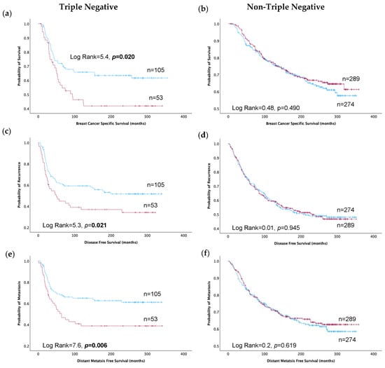 Kaplan–Meier estimates depicting TRIM2 high (red line) and TRIM2 low (blue line) protein expression and survival outcomes in triple-negative and non-triple-negative breast cancer: (a,b) Breast cancer-specific survival. (c,d) Disease-free survival. (e,f) Distant metastasis-free survival.