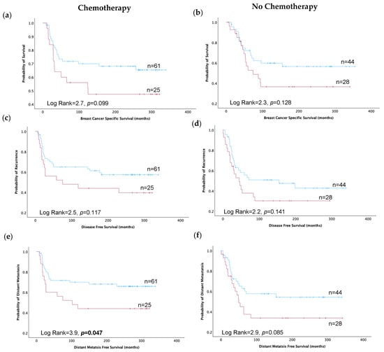 Kaplan–Meier estimates depicting TRIM2 high (red line) and TRIM2 low (blue line) protein expression and survival outcomes in triple-negative breast cancer patients treated with or without chemotherapy: (a,b) Breast cancer-specific survival. (c,d) Disease-free survival. (e,f) Distant metastasis-free survival.