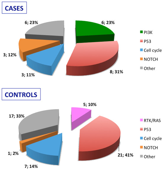 Stratification of the mutated genes was then performed according to the molecular pathways they belong to for both relapsed cases and relapse-free controls (Figure 2). Mutated genes were then grouped according to their role in oncogenic signaling pathways recognized in the cancer genome atlas [18]: RTK/RAS pathway, PI3K pathway, p53 pathway, NOTCH pathway, and cell cycle pathway. As detailed in Figure 2, the PIK pathway was involved in cases but not in controls, and, conversely, the RTK/RAS pathway was exclusively affected in controls.