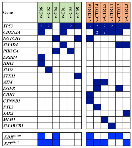 Spectrum and distribution of pathogenic/likely pathogenic mutations (dark blue squares) among cases (C) and controls (CTRL) from the discovery cohort. In light blue, the VUS variants of the KDR and KIT genes are indicated. Numbers in squares indicate the total number of multiple mutations detected in each sample.