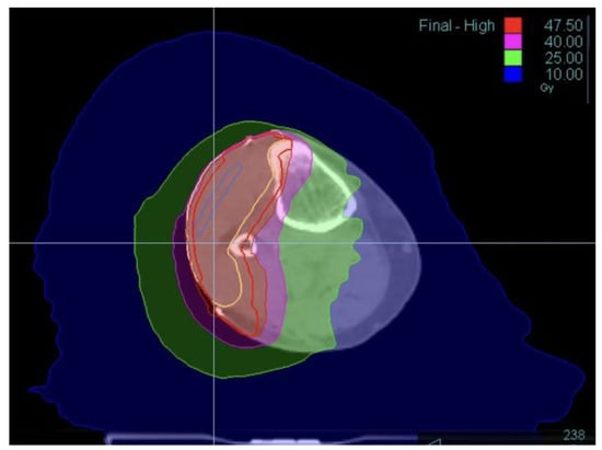 The delineation of target volumes (GTV, CTV, PTV) has already been described previously [15] (Figure 1). Irradiation of the entire circumference of the limb was avoided with the incorporation of a dosimetry-defined volume of normal tissue called the “skin corridor”. This corridor comprised at least 25% of the limb’s circumference, corresponding to approximately 10% of the cross-sectional area of the limb. The aim was to preserve lymphatic drainage and minimize the risk of lymphedema. The dose within the corridor was carefully restricted to no more than 35 Gy [17]. Dosimetric data of the skin corridor were available for 26 patients. The conformity index (CI) was calculated for all treatment plans with available data using the formula defined by ICRU 62 and originally utilized in the RTOG 90-05 study with a 95% isodose [18,19]: CI = Vprescription/Vtarget, where Vprescription is the volume covered by the 95% prescription isodose surface, and Vtarget is the target volume. A CI close to 1 is optimal. The homogeneity index (HI) was calculated using the following formula: HI = (Dmax − Dmin)/Dprescription, where Dmax is the maximum dose received by any point within the target volume, Dmin is the minimum dose received by any point within the target volume, and Dprescription is the prescribed dose for the target volume. An HI close to 0 is optimal.