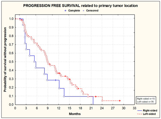 Kaplan–Meier plots illustrating progression-free survival according to primary tumor location (p = 0.1072; Wilcoxon test).