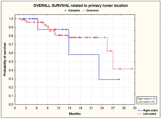 Kaplan–Meier plots illustrating overall survival according to primary tumor location (p = 0.9694; Wilcoxon test).