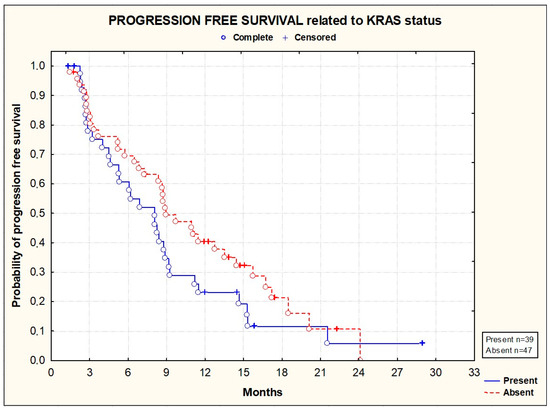 Kaplan–Meier plots illustrating progression-free survival according to KRAS status (p = 0.1637; Gehan–Wilcoxon test).