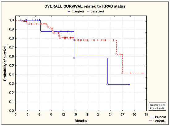 Kaplan–Meier plots illustrating overall survival according to KRAS status (p = 0.4045; Gehan–Wilcoxon test).