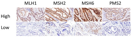 Representative immunohistochemical staining of MMR proteins in tumors. Expression of MutL homolog 1 (MLH1), MutS homolog 2 (MSH2), MutS homolog 6 (MSH6), and PMS1 homolog 2 (PMS2) in formalin-fixed paraffin-embedded (FFPE) tissue samples identified as normal expression (top row, labeled as high) and loss of staining (bottom row, labeled as low); magnification, 20×.