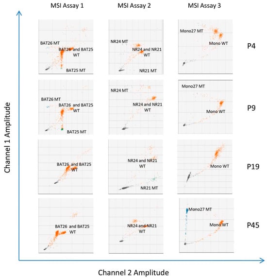 Two-dimensional droplet fluorescence plots from the three Bio-Rad ddPCR™ MSI assays (i.e., for BAT25 and BAT26, NR21 and NR24, and Mono27) performed on four patient samples (P4, P9, P19, and P45). Wild-type molecules are indicated by orange clusters, and unstable microsatellite molecules are indicated by blue clusters. The individual targets are shown on each plot.