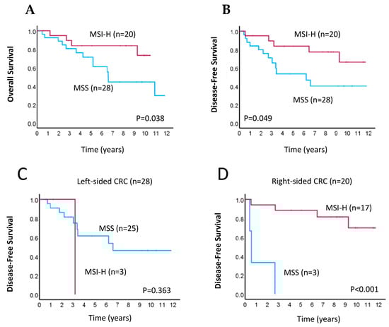 We then determined the association between MSI status by ddPCR-based detection and survival of patients with CRC. In the Kaplan–Meier survival analysis, we found that patients with MSI-H had better overall survival (OS; p = 0.038, Figure 3A) and disease-free survival (DFS; p = 0.049, Figure 3B) than patients with MSS, as determined by the log-rank test. We further investigated whether MSI status was associated with DFS in patients with differing primary tumor locations (i.e., right- vs. left-sided CRC). The results showed that, for patients with right-sided CRC, those with MSI-H had significantly higher mean DFS than patients with MSS (p < 0.001, Figure 3D); however, this association was not observed in those with left-sided CRC (p = 0.363, Figure 3C). Our results therefore suggest that MSI-H tumors have a better prognosis than MSS or MSI-L tumors, particularly for patients with right-sided primary CRC.