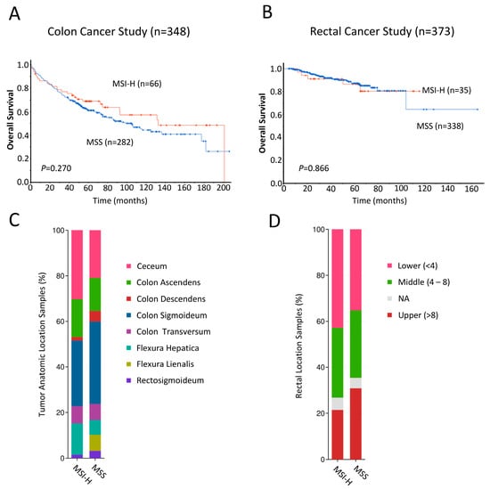 Lastly, to validate our findings, we analyzed RNA sequencing data from the cBioPortal for Cancer Genomics (http://www.cBioPortal.org, accessed on 30 November 2023) obtained from two individual cohorts of colon cancer [32] and rectal cancer patients [33]. For both cohorts, we generated Kaplan–Meier curves and calculated the log-rank p-values comparing MSI status, determined previously based on mRNA expression levels of MMR genes [32,33], and patient survival, as described in the Materials and Methods section. In the colon cancer cohort, Kaplan–Meier curves revealed that MSI-H patients showed a trend toward favorable survival probability (n = 348, p = 0.270; Figure 4A), but this association was not observed for those in the rectal cancer cohort (n = 373, p = 0.866; Figure 4B). MSI-H and MSS samples from the colon cancer cohort and rectal cancer cohort stratified based on primary tumor location are shown in Figure 4C and Figure 4D, respectively.