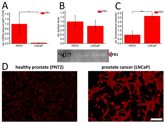 Folate receptor 1 expression in healthy PNT2 and prostate cancer cells (LNCaP). Folate receptor 1 (FR1/red) was quantified by qRT-PCR (A), Western blot (B) and immunofluorescence (C,D). The graphs show relative values calculated to healthy control cells. In (B), a representative Western blot membrane with the corresponding marker band (black) at 37 kDa is shown. The effective protein load was detected by BioRad-stain-free technology, enabling adjustment of protein loads by quantification of total protein levels. p-values of * 0.05, ** 0.01 and *** 0.001 were labeled with one to three asterisks indicating significances from at least 3 independent experiments. Scalebar 100 µm.