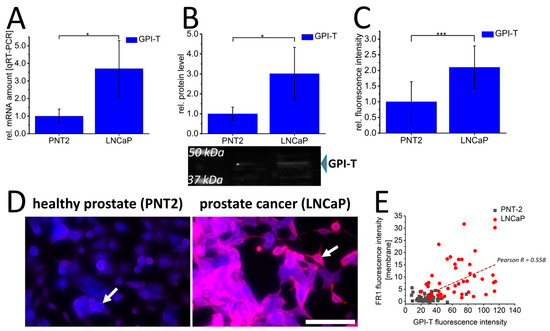Glycosylphosphatidylinositol transamidase expression and folate receptor 1 localization in prostate cancer cells (LNCaP) and healthy prostate epithelial cells (PNT2). Glycosylphosphatidylinositol transamidase (GPI-T/blue) was quantified by qRT-PCR (A), Western blot (B) and immunofluorescence (C,D) in healthy PNT2 and prostate cancer cells (LNCaP). In (D), immunofluorescence against FR1 (red) is additionally shown; white arrows indicate membrane signals. Correlation between FR1-membrane fluorescence intensity and GPI-T fluorescence intensity in healthy PNT2 (gray squares) and LNCaP cancer cells (red circles) with corresponding correlation value Pearson R is shown in (E). The graphs (A–C) show the relative values calculated for the healthy control cell. (B) shows a representative Western blot membrane with the corresponding marker bands at 37 kDa and 50 kDa. The effective protein load was detected by BioRad-stain-free technology, enabling adjustment of protein loads by quantification of total protein levels. p-values of * 0.05, ** 0.01 and *** 0.001 were labeled with one to three asterisks indicating significances from at least 3 independent experiments. Scalebar 100 µm.