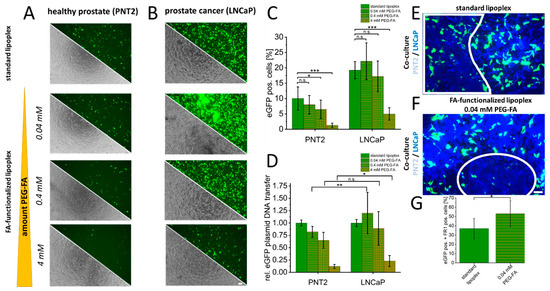 To characterize the potential of FR1 as a target receptor for the selective transfer of therapeutics, standard and FA-functionalized lipoplexes were used to transfer eGFP-pDNA in healthy PNT2 and LNCaP cancer cells. Standard lipoplexes without FA-functionalization were used to transfer eGFP-pDNA as a control in both cell types (PNT2 and LNCaP). Additionally, the same lipoplexes were functionalized by NHS chemistry using different amounts of PEG-FA (0.04–4 mM). The transfection efficiencies were examined by fluorescence microscopy (Figure 3A,B) and quantified by flow cytometry (Figure 3C). Alterations in transfer efficiencies for each cell type clearly show that a more accelerated decrease in transfer efficiency is induced in healthy PNT2 cells by the PEG dilemma, and FA functionalization can more distinctively optimize transfer efficiency in LNCaP cells. For PNT2, a significant reduction of more than 30% was already detectable at 0.4 mM PEG-FA. At this concentration, LNCaP cells showed a non-significant but slight increase compared to non-functionalized eGFP-lipoplexes (Figure 3C). In addition, flow cytometry assays were used to characterize the differential specificity of DNA transfer using FA-functionalized lipoplexes. Here, improvements in the specificity of 9–32% were shown for the corresponding PEG-FA functionalized lipoplexes with significant improvements for 0.04 mM (32% s.d. 35%) and 4 mM (9% s.d. 11%) (Figure 3D). Comparable results were obtained for the VCap prostate cancer cell line, where a slight, non-significant improvement was obtained with 0.4 mM PEG-FA, resulting in a significant improvement for selectivity of 112% (s.d. 157%; see Supplementary Figure S2). To validate this specificity and selectivity, a co-culture of PNT2 and LNCaP cells was prepared, and standard lipoplexes were characterized in comparison to FA-functionalized lipoplexes. In addition, GPI-T-immunofluorescence was used to differentiate between healthy PNT2 and LNCaP cancer cells. It was shown that GPI-T-immunofluorescence allowed a clear separation of both cell types due to lower signal intensities of GPI-T-immunofluorescence in PNT2 cells (white boxes, Figure 3E,F). Moreover, fluorescence microscopy images indicated an improved selectivity of eGFP-plasmid DNA transfer by FA-functionalized lipoplexes. To further quantify this improved selectivity, equally processed cells (transfection of standard lipoplex or functionalized lipoplex followed by GPI-T-immunofluorescence) were analyzed by flow cytometry. A significant and more than 20% enhanced eGFP-pDNA transfer by FA-functionalization into the accordingly more intense GPI-T-stained LNCaP cells could be detected (Figure 3G).