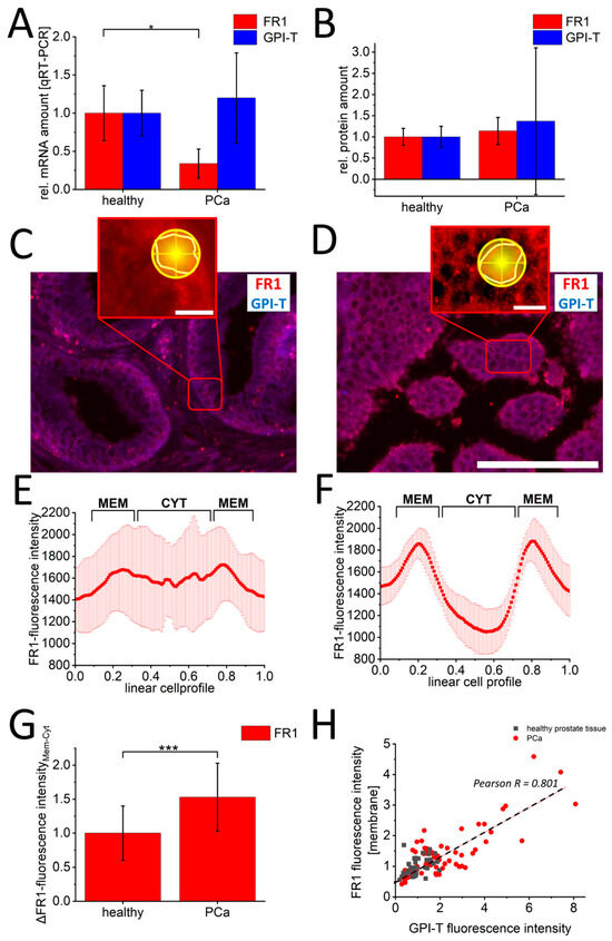 To verify the clinical significance of these findings, identical FR1 and GPI-T characterizations were performed on healthy prostate specimens (n = 3) and PCa sections (n = 6). Here, qRT-PCR-analysis (Figure 4A) of GPI-T- and FR1-mRNA quantification confirmed cell culture results with significantly increased FR1-mRNA values for the healthy sections (1.0 s.d. 0.36) compared to PCa patients (0.34 s.d. 0.19). For GPI-T, non-significantly increased mRNA values for PCa patients (1.2 s.d. 0.59) were detected compared to healthy control sections (1.0 s.d. 0.29). Likewise, protein quantification (Figure 4B) showed non-significant changes in PCa sections with 1.14-fold (s.d. 0.32) increased values of FR1 and 1.37-fold (s.d. 1.73) increased GPI-T-protein amount compared to healthy tissue sections. Even the quantification of single-cell fluorescence intensities in immunofluorescence images (Figure 4C,D) with FR1 and GPI-T did not allow a precise differentiation between healthy and PCa sections (see Supplementary Figure S3). However, altered localizations of FR1-signals could also be detected in single-cell analysis of tissues from PCa sections compared to healthy tissue. Linear cell profiles of healthy (Figure 4E) and PCa tissue (Figure 4F) indicated a significant signal shift in cancer cells with 1.31-fold (s.d. 0.6) increased fluorescence intensity in the cell membrane compared to FR1-membrane signal intensities of healthy cells (Figure 4G). Moreover, a clear correlation (Pearson R = 0.801) between GPI-T expression and resulting FR1-membrane localization was observed in tissue experiments. (Figure 4H).