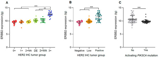 - Berns, K.; Horlings, H.M.; Hennessy, B.T.; Madiredjo, M.; Hijmans, E.M.; Beelen, K.; Linn, S.C.; Gonzalez-Angulo, A.M.; Stemke-Hale, K.; Hauptmann, M.; et al. A Functional Genetic Approach Identifies the PI3K Pathway as a Major Determinant of Trastuzumab Resistance in Breast Cancer. Cancer Cell 2007, 12, 395–402. [Google Scholar] [CrossRef]