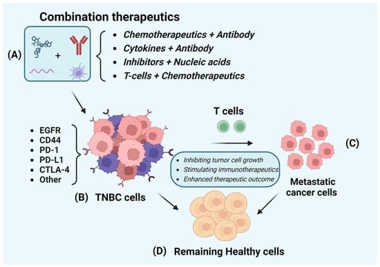 Schematic diagram of combination therapy against TNBC. (A) Illustrates a combination of therapeutics; (B) presents TNBC cells that express various ligands; (C) metastatic cancer cells that are located in other areas than primary tumor tissue; and (D) the remaining healthy tissue after combination treatment. Created with Biorender.com, accessed on 6 February 2024.