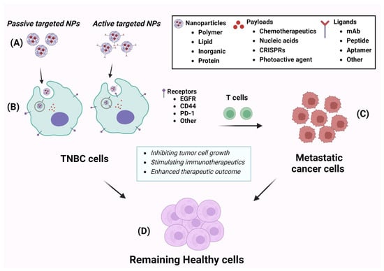 The schematic diagram for nanoparticle-based therapy against TNBC. (A) Illustrates drug-loaded nanoparticles; (B) presents internalization of nanoparticles through TNBC cells; (C) metastatic cancer cells that are located in areas other than primary tumor tissue; and (D) the remaining healthy tissue after treatment of nanoparticle-based therapeutics. Created with Biorender.com, accessed on 6 February 2024.