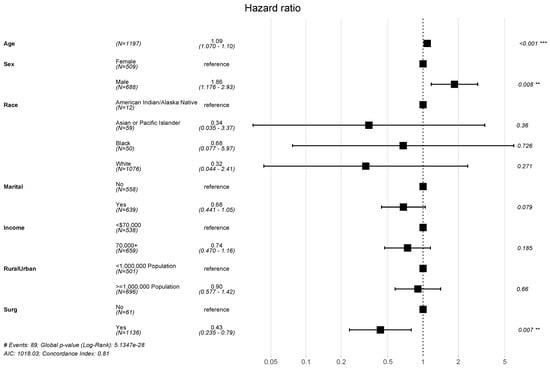 Normality of distributions of continuous variables was assessed with visual inspection via density plots and quantile–quantile plots and was assessed quantitatively with the Shapiro–Wilk test. All tested variables were not normally distributed (Shapiro–Wilk p < 0.001), and thus, non-parametric approaches were used for the remainder of the analysis. Analysis of variance (ANOVA) and chi-square tests were used to characterize differences in variables of interest between cohorts of patients receiving different treatment modalities, for continuous and categorical variables, respectively. Median follow-up time was calculated via the reverse Kaplan–Meier method described by Schemper and Smith, in which being alive at last follow-up was designated as the event of interest while death from any cause was censored [19]. Cox proportional hazards regression analysis was performed to examine the association between all-cause mortality and age at diagnosis, sex, race, marital status, income status, population density, and surgical status. In this analysis, individuals who remained alive at the conclusion of the follow-up period were treated as censored observations. Hazard ratios and p-values were calculated and illustrated as a forest plot. All statistical analyses were carried out using R version 4.3.2 (R Foundation for Statistical Computing, Vienna, Austria) with 2-sided testing and a statistical significance threshold of 0.05.