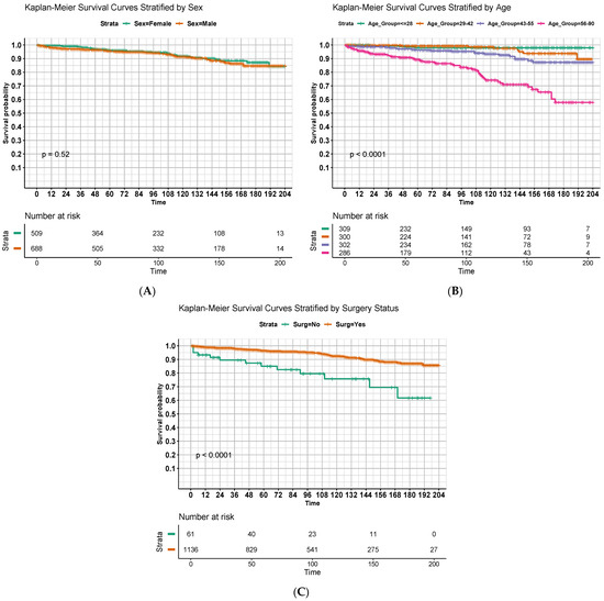 Figure 2 displays OS estimates with respect to months since diagnosis using the Kaplan–Meier method with stratification by significant predictors identified in the multivariable model. Univariate comparisons of curves using the log-rank method are displayed as well. Younger age (Figure 2B, p < 0.001) and receipt of surgery (Figure 2C, p < 0.001) were again significantly predictive of improved OS, although there was no apparent difference in survival curves based on sex (Figure 2A, p = 0.52).