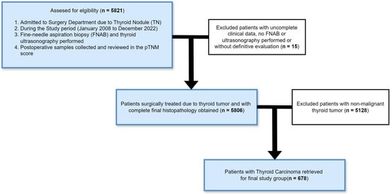 This retrospective analysis involved analysing the records of 5806 patients who were consecutively surgically treated for single and multiple thyroid nodules (TNs) between January 2008 and December 2022 in the Department of General, Minimally Invasive, and Endocrine Surgery at Wroclaw Medical University. After the application of patient inclusion and exclusion criteria, 678 (11.7%) patients were included in the study cohort. The selection process is presented in a flow diagram in Figure 1.