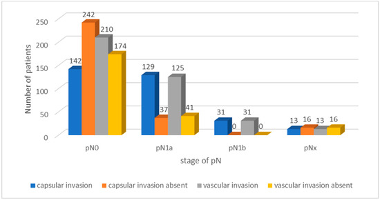 Analysis of thyroid encapsulation and vascular invasion among well-differentiated TC patients revealed different results. Of the total cohort, 385 (62.95%) patients were classified as pN0. Within this group, 142 (36.98%) patients showed invasion of the thyroid capsule, while 242 (63.02%) showed no evidence of invasion. A total of 210 (54.69%) pN0 patients presented with vascular invasion, while 174 (45.31%) showed no evidence of vascular invasion. Among the 166 pN1a patients (27.21%), 129 (77.71%) also exhibited invasion of the thyroid capsule and 125 (75.30%) exhibited vascular invasion. Among pN1b patients, 31 (5.09%) had both thyroid capsule invasion and vascular invasion. Additionally, 29 (4.75%) patients were classified as pNx, among whom 13 (44.83%) showed thyroid capsule invasion, and 13 (44.83%) showed vascular invasion. The results are presented in Table 2 and Figure 2.