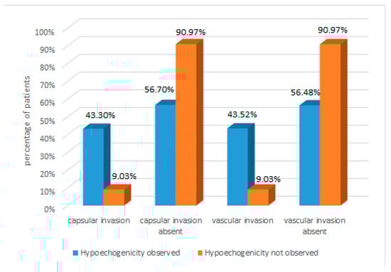 Data analysis revealed that hypoechogenicity was common among well-differentiated TC patients (observed in 74.59%). Encapsulation was present in 43.30% of these patients, but only in 9.03% of patients without hypoechogenicity. These results suggest that hypoechogenicity may be an indicator of a greater tendency for encapsulation. Similarly, vascular invasion was more frequent in patients with hypoechogenicity (43.52%) than in those without hypoechogenicity (9.03%). This indicates a potential correlation between hypoechogenicity and vascular invasion in TC patients. The results are presented in Figure 3.