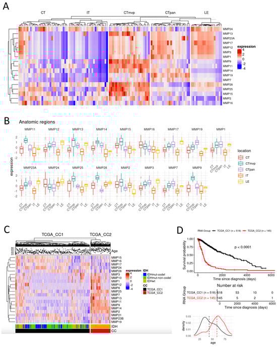 For computational analysis, normalized RNASeq expression data were downloaded from TCGA as R MultiAssayExperiment objects, and the IVY GAP database was used (https://glioblastoma.alleninstitute.org, database was accessed on 25 January 2024). The total 662 glioma samples (516 Lower Grade Gliomas and 156 GBMs) of the TCGA database were utilized to analyze the MMP gene expression in glioma patient samples. The IVY GAP (IVY Glioblastoma Atlas Project) dataset was utilized to assess MMP expression levels. All glioma patient samples from TCGA were employed for unsupervised clustering based on the expression of MMP genes, which resulted in two MMP molecular subtypes: CC1 and CC2. Kaplan Meier overall survival (OS) analysis was conducted with a log-rank test to assess differences in the overall survival of patients based on CC1 versus CC2 subtype membership.
