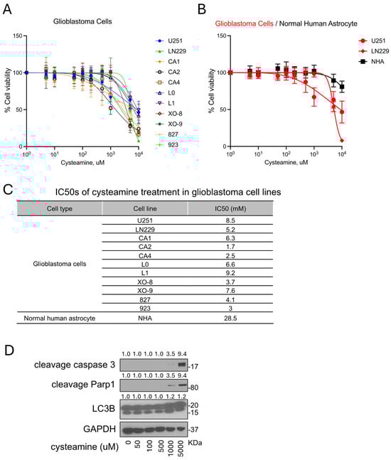 Micromolar concentrations of cysteamine do not affect tumor cell growth and cell death in GBM. (A) GBM cell viability was assessed using CellTiter-Glo assay. Briefly, 1 × 103 cells of each cell line were seeded per well in a 96-well plate and incubated overnight for drug treatment. The following day, the cells were treated with multiple concentrations of cysteamine (0, 0.005, 0.01, 0.05, 0.1, 0.2, 0.5, 1, 5, and 10 mM) for 48 h, followed by CellTiter-Glo cell viability assays. (B) The cell viability assay was performed in NHA cells, and the result was compared to U251 and LN229. (C) The percentages of cell viability and IC50 were calculated using Prism and Excel software. (D) U251 cells were incubated with cysteamine in a dose-dependent manner (0, 0.05, 0.1, 0.5, 1, and 5 mM) for 48 h, as indicated, followed by western blotting for cleaved caspase 3, cleaved Parp1, LC3B, and GAPDH. Original western blots are presented in File S1.
