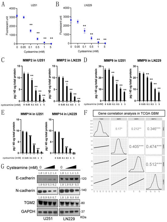 Cysteamine decreases MMP2/9 and MMP14 activity in GBM. (A,B) U251 and LN229 cells were cultured and treated with cysteamine for 48 h in a dose-dependent manner (0, 0.05, 0.1, 0.5, 1, and 5 mM) to assess changes in invasion and migration. Fluorescence-based MMP activity was determined using the manufacturer’s protocol. (C–E) A human-specific MMP2/MMP9/MMP14 solid-phase sandwich ELISA (enzyme-linked immunosorbent assay), designed to measure the amount of the target bound between a matched antibody pair, was performed. U251 and LN229 cells, in response to changes in invasion and migration, were cultured and treated with cysteamine for 48 h in a dose-dependent manner (0, 0.05, 0.1, 0.5, 1, and 5 mM). Cell lysates were collected, centrifuged at 12,000 rpm for 10 min, and, after centrifugation, the supernatant was collected. Forty micrograms of proteins for each sample were used for this assay, which was carried out according to the manufacturer’s protocols. (F) Correlation between TGM2 and MMPs mRNA expression in all TCGA GBM specimens. R-value for the coefficient of correlation was represented as shown in the figure. The significance of the differences was evaluated using the independent Student’s t-test; p-value significant level represents * for p-value < 0.05, ** for p-value < 0.01, and *** p-value < 0.001, respectively. (G) U251 and LN229 cell lines were incubated with cysteamine in a dose-dependent manner (0, 0.05, 0.1, and 0.5 mM) for 48 h, followed by western blotting for E-cadherin, N-cadherin, TGM2 and GAPDH. Original western blots are presented in File S2.