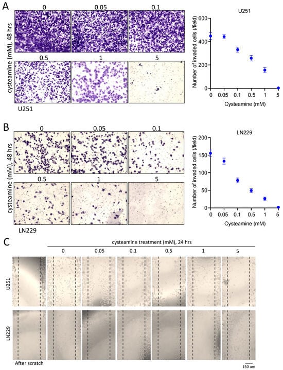 Cysteamine inhibits cancer cell invasion and migration. (A,B) GBM cell-invasive capacity was assessed using Matrigel invasion assay. Cells were treated with cysteamine in a dose-dependent manner (0, 0.05, 0.1, 0.5, 1, and 5 mM) before seeding into the Matrigel invasion chamber for 24 h, followed by invasion assay as shown in the Section 4. (C) GBM cells were seeded onto 12-well plates at a density of 2 × 105 cells. When cells reached 95–100% confluence, a scratch was created using a 200 μL pipette tip, and cells were then treated with cysteamine in a dose-dependent manner (0, 0.05, 0.1, 0.5, 1, and 5 mM). After 24 h, the created wounds were observed every 24 h and photographed using an EVOS cell imaging system.