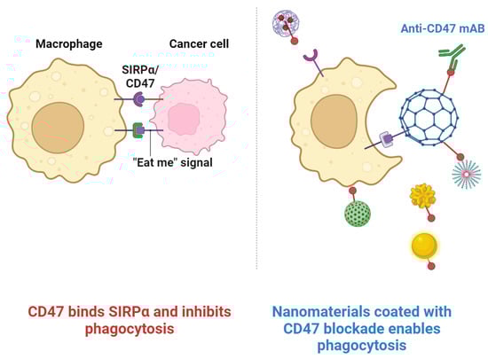 The interaction between CD47 and SIRP is crucial for maintaining homeostasis of the immune system. CD47 binds to SIRP, sends a “do not eat me” signal to macrophages, and inhibits phagocytosis. The blockade of this interaction by anti-CD47 monoclonal antibodies allows macrophages to phagocytize cancer cells. Anti-CD47 mAbs encapsulated in nanomaterials can thus be used to ensure that their delivery is targeted and is more efficient in inhibiting the interaction between CD47 and SIRP. This represents a bright milestone in the development of cancer immunotherapies. Images were acquired using Biorender.com software.