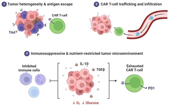 Tumor heterogeneity and antigen escape in CAR T cell therapy. CAR T cells navigate the tumor microenvironment, including the immunosuppressive milieu characterized by IL-10 and TGF secretion. This leads to reduced oxygen levels, glucose depletion, immune cell inhibition, and CAR-T-cell exhaustion. The images were generated using Biorender.com software.