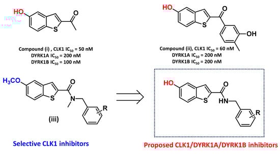 Based on the inhibitory profile of the previously reported 5-hydroxybenzothiophene ketones (compounds i and ii, Figure 1), we surmised that the exchange of the 5-methoxy in our previously presented 5-methoxybenzothiophene-2-carboxamides selective Clk1 inhibitors (iii) with a free hydroxyl possibly expands the inhibitory profile toward the related kinases, Dyrk1A and Dyrk1B, which should provide multi-targeted anticancer kinase inhibitors [].