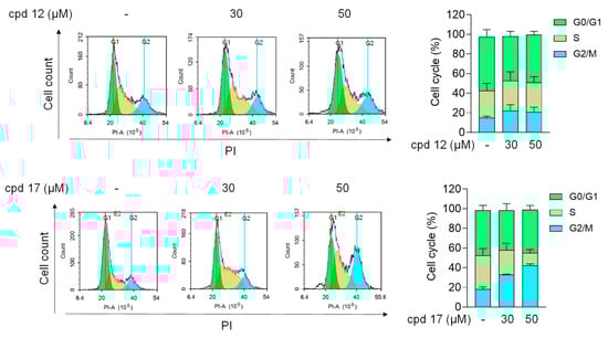 Analysis of cell cycle progression upon treatment with compounds 12 and 17. T24 cells were treated with DMSO (0.1%), 12 (30–50 µM), or 17 (30–50 µM) for 24 h. Cell cycle was examined by propidium iodide (PI) staining and flow cytometry. All data are expressed as the mean ± S.E.M. (n = 3).