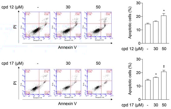 Annexin V and PI staining in T24 cells to investigate if compounds 12 and 17 could induce apoptotic death. T24 cells were treated with DMSO (0.1%), 12 (30–50 µM), or 17 (30–50 µM) for 24 h and then stained with Annexin V-FITC antibody and PI. The Annexin V-positive apoptotic cells were monitored using flow cytometry. All data are expressed as the mean ± S.E.M. (n = 3). * p < 0.05, ** p < 0.01 compared with the DMSO group.