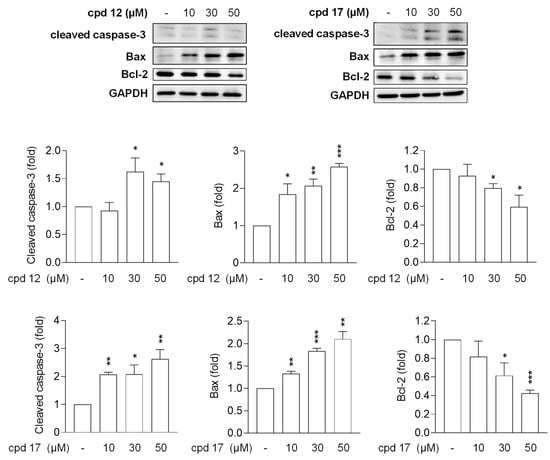 Examining the effect of 12 and 17 on proapoptotic and antiapoptotic pathways. T24 cells were treated with DMSO (0.1%), 12 (30–50 µM), or 17 (30–50 µM) for 24 h. Expression levels of cleaved caspase-3, Bax, Bcl-2, and GAPDH were analyzed by Western blot by corresponding antibodies. The quantitation of the cleaved caspase-3/GAPDH, Bax/GAPDH, and Bcl-2/GAPDH ratio are shown. All data are expressed as the mean ± S.E.M. (n = 3). * p < 0.05, ** p < 0.01, *** p < 0.001 compared with the DMSO group.