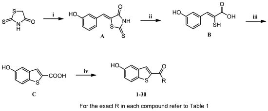 All planned final compounds were obtained through an amide coupling reaction between different benzyl amines and 5-hydroxy-benzo[b]thiophene-2-carboxylic acid (compound C, Scheme 1). The synthesis of the carboxylic acid (compound C) was successfully achieved through a trio of reactions outlined in Scheme 1. Initially, a reaction involving aldol condensation was conducted between rhodanine and 3-hydroxybenzaldehyde, utilizing glacial acetic acid and anhydrous sodium acetate, resulting in the formation of an α, β-unsaturated aldehyde (compound A). Subsequently, compound A underwent alkaline hydrolysis, employing sodium hydroxide, transforming into β-substituted-α-mercaptoacrylic acid (compound B). The third reaction involved the cyclization of compound B in the presence of iodine, leading to the formation of 5-hydroxy-benzo[b]thiophene-2-carboxylic acid (C). A comprehensive set of amide derivatives (1–30) was synthesized by reacting compound C with a variety of amines, employing EDC as the coupling agent and DMAP as the base, all within a DMF solvent environment (Scheme 1).