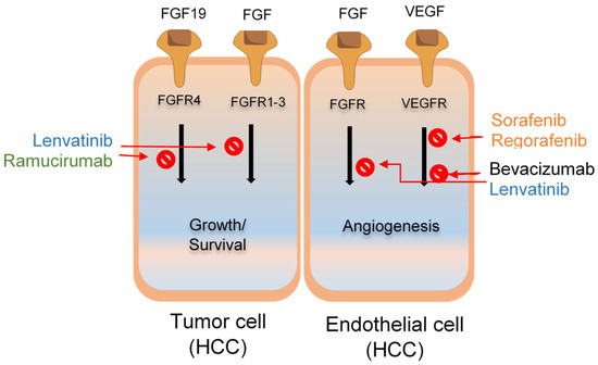 Lenvatinib is an oral MKI with multiple targets, i.e., FGFR, VEGFR, PDGFR-α, KIT, and RET. Lenvatinib has an effective antiangiogenic activity and inhibits the signaling pathways of FGF and VEGF [41] (Figure 2). Its antitumor effect suppresses hepatocyte proliferation by obstructing the signals of FGF through the inhibition of FRS2 phosphorylation [42]. The oxygen supply is limited to the site of a tumor, resulting in cell death. Lenvatinib binds to the receptor in a Type V binding manner, thus inhibiting kinase activity [43]. Lenvatinib, rather than sorafenib, depleted the rate of angiopoietin 2 (Ang 2), a protein responsible for increasing the size of the tumor by regulating the TIE2 receptor [44]. The overexpression of VEGF is interrelated to advanced HCC and angiogenesis. The signaling pathway of FGF activates malignancy in the HCC accordingly, and thus FGF is another molecular factor for tumor growth [45]. Lenvatinib also has antiproliferative activity, targeting the FGF pathway in cancer cells [42]. It inhibits angiogenesis more effectively than sorafenib, which might not block the FGF pathway. This effect is assumed to be associated with lenvatinib, which hindered both FGFR and VEGFR [46].