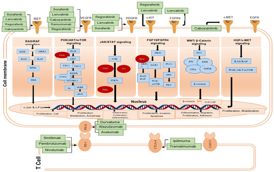 Cabozantinib is also another TKI for MET and VEGFR2, but it also targets RET, KIT, and AXL. The biomarkers MET, ANG2, HGF, VEGF-A, GAS6, and IL-8 may be used to predict the prognosis of a patient after receiving cabozantinib [66]. Human cancer development has been linked to the tyrosine kinase receptor MET, which is encoded by the MET gene to interact with the hepatocyte growth factor (HGF) to activate downstream pathways and promote cell proliferation, migration, and angiogenesis [67]. Additionally, studies have evaluated the overexpression of MET in several human malignancies, including HCC. Gene therapy is used to inhibit MET expression, reducing proliferation, angiogenesis, and tumor development [68]. The blocking of MET and VEGFR pathways simultaneously may improve the effectiveness of HCC treatment [69].