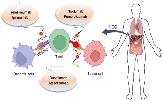 PD-1 is a crucial immunological checkpoint and is widely expressed in myeloid, B, and T cells. The most significant advancement in cancer treatment during the past few years has been T-cell checkpoint inhibition [16]. Immune cells, i.e., macrophages, natural killer, T, and B cells, express membrane-bound molecules called immunological checkpoints to regulate the immune response [85]. Several checkpoint molecules, namely PD-1 on T cells, PD-L1 on tumor cells, and CTLA-4 on antigen-presenting cells or tumor cells, are most frequently researched in human cancer [86] (Figure 4). Chronic inflammation, intrinsic immunodeficiency, and high regulation of immune checkpoints such as the PD-1, PD-L1, and CTLA-4 pathways are all characteristics of the microenvironment where HCC frequently develops [87].