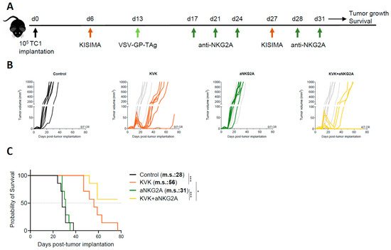 To evaluate the impact of NKG2A blockade on the antitumoral efficacy induced by KISIMA—VSV-GP-TAg (KVK) vaccination, C57BL/6J mice were subcutaneously implanted with TC-1 tumor cells. When tumors were palpable (D6 post tumor implantation), mice were vaccinated with KISIMA containing HPV-E7-derived CD8 epitope (Supplementary Table S1). One week later, mice received VSV-GP-HPV (containing HPV-derived CD8 epitope) intravenously followed by a second boost with KISIMA at day 27 (Figure 1A). Therapeutic KVK vaccination induced significant regression of established TC-1 tumors in all treated animals (Figure 1B).