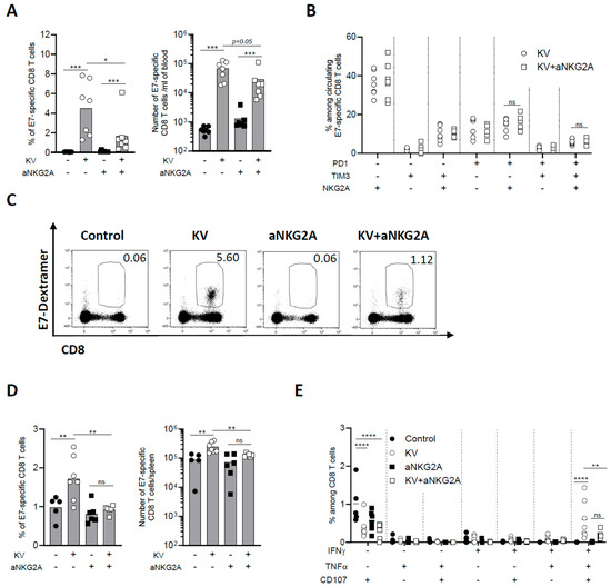 The effect of KV—anti-NKG2A combinatory treatment was then assessed on peripheral CD8 T cell immune response. One week post VSV-GP-TAg boost, the frequency and number of circulating E7-specific CD8 T cells were negligeable in non-vaccinated mice, as expected from a lowly immunogenic tumor as TC-1, whereas KV vaccination induced a significant increase of antigen-specific CD8 T cells (Figure 3A). NKG2A blockade alone did not enhance peripheral immunogenicity of TC-1 tumors; however, when combined with KV vaccination, it surprisingly and significantly decreased the frequency of circulating antigen specific CD8 T cells (Figure 3A).