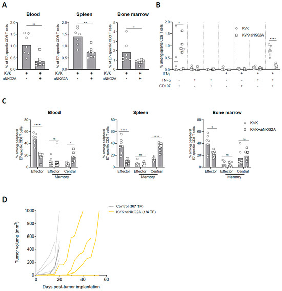 NKG2A blockade dampens long-term protection elicited by KISIMA—VSV-GP-TAg vaccination. TC-1 tumor-bearing mice were vaccinated with KISIMA-Mad25 vaccine at D6 post tumor implantation followed by a boost with VSV-GP-HPV at D13 and a second boost with KISIMA at D27. Mice were treated with anti-NKG2A starting 4 days post VSV-GP-HPV injection for a total of five injections. Mice were sacrificed at D45, tumor, spleen and bone marrow were harvested, processed and CD8 T cell immune response was analyzed by flow cytometry. (A) Frequency of E7-specific among CD8 T cells in blood, spleen, and bone marrow. (B) Cytokine production by antigen specific CD8 T cells in the spleen was measured by intracellular staining after ex-vivo restimulation with E7 peptide in the presence of Golgi inhibitor. (C) Memory phenotype of E7-specific CD8 T cells analyzed by flow cytometry in blood, spleen, and bone marrow at D45 post tumor implantation. (D) Complete responders were rechallenged at D75 with 105 TC-1 cells and tumor growth was followed. Two-way ANOVA with Sidak’s multiple comparisons were used (* p < 0.05, ** p < 0.01, **** p < 0.0001) except in fig. A where Mann–Whitney test was used (* p < 0.05, ** p < 0.01). One representative of two independent experiments (n = 6–7).