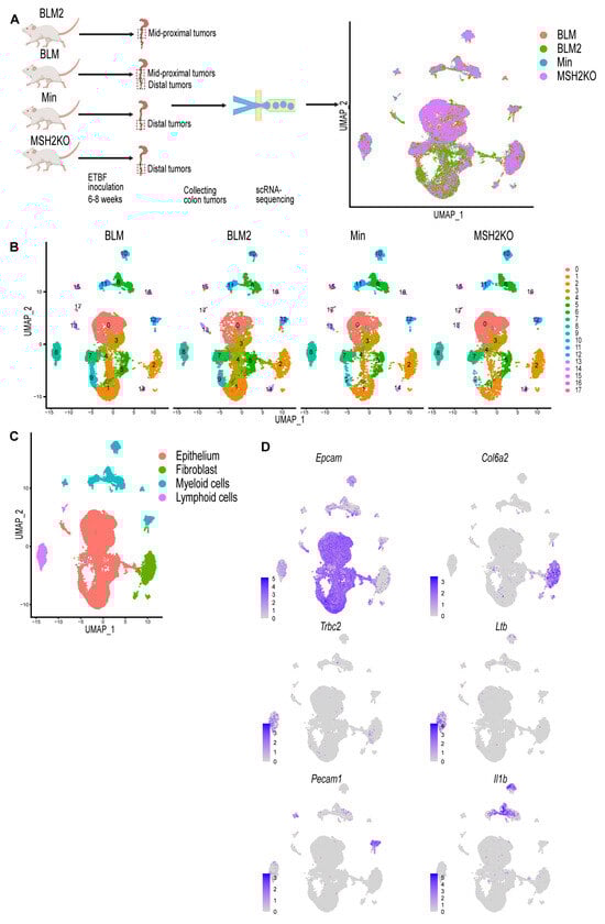 To investigate whether the BRAF mutation or Msh2 deletion, which is associated with MSI, modifies the cellular composition of ETBF-driven colon tumors, ETBF colonization of BLM, MSH2KO, and Min C57BL/6 mice was performed. For each sample, colon tumors were harvested after 6–8 weeks of ETBF colonization, pooled, and enzymatically digested. Then, scRNA-seq was performed using droplet-based microfluidics (10X Genomics) (Figure 1A). scRNA-seq of tumors from BLM mice from two different experimental cohorts was performed with the samples labeled BLM and BLM2. BLM and BLM2 tumors were harvested after 6 and 8 weeks of ETBF colonization, respectively. Due to the formation of tumors in different regions of the colon in the mouse models used, Min and MSH2KO tumors were harvested from the distal colon, BLM tumors were harvested from the distal and mid-proximal colon, and BLM2 tumors were harvested from the mid-proximal colon only. The number of total single cells initially sequenced from each sample was BLM: 12,273, BLM2: 12,733, MSH2KO: 9618, and Min: 7535.