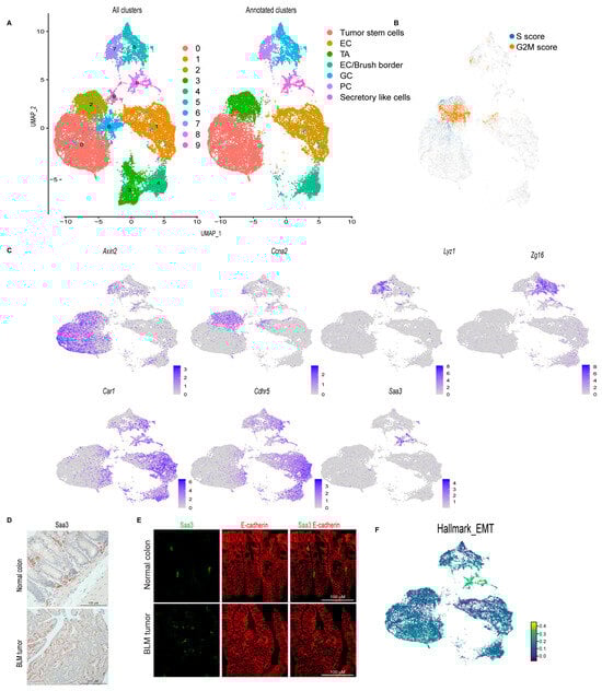 To focus our study on colon tumor differentiation, we extracted the epithelial cells from the dataset and re-clustered them to produce 10 distinct epithelial cell clusters (Figure 2A). Proliferating cells were identified using cell-cycle signatures (Figure 2B). Seurat FindAllMarkers was utilized to identify transcripts enriched for each cluster, and then each cluster was manually annotated (Supplemental Table S1). We identified a tumor stem cell cluster (cluster 0) with Axin2, Sox4, Ccnd2, and Clu expression (Figure 2C, Supplemental Figure S2). Transit-amplifying cells (TA; cluster 2) were enriched for proliferating markers; Ccna2, Pcna, Hmgn2, Mcm5, Top2a, Mki67 (Figure 2C, Supplemental Figure S2), which is consistent with the cell-cycle signature result (Figure 2B). Paneth cells (PC; cluster 7) were identified by the expression of the anti-microbial genes Lyz1, Ang4, Spink4, and Mmp7 (Figure 2C, Supplemental Figure S2). Goblet cells (GC; cluster 5) were marked by the elevated expression of Zg16, Fcgbp, Tff3, Muc2, and Sval1 (Figure 2C, Supplemental Figure S2). Cluster 1 was labeled as enterocyte cells (EC) due to its enrichment with Car1, Fabp2, Slc26a3, and Ndrg1 (Figure 2C, Supplemental Figure S2). Enterocytes/brush-border cells (cluster 4) were marked by elevated levels of Cdhr5, Car4, Aqp8, Guca2a, Saa1, and Espn (Figure 2C, Supplemental Figure S2). Cluster 8 was characterized by the expression of markers that are normally expressed in fibroblasts such as Saa3, Dcn, Lgals1, and Bmp4 (Figure 2C, Supplemental Figure S2). Because several of these genes, such as Saa3 and Dcn, have previously been shown to also be expressed in goblet cells [42,43], this cluster was labeled “secretory-like cells” (Figure 2C, Supplemental Figure S2). Additionally, to confirm that this cluster is indeed part of the colon tumor epithelium, we performed IHC for SAA3. While we detected SAA3-positive cells in the epithelial tumor tissue, Saa3-stained cells were mainly stromal cells in the normal colon (Figure 2D). To follow up on our IHC result, we performed immunofluorescence staining for both SAA3 and E-cadherin (an epithelial cell marker). In BLM tumor tissue, unlike normal colon tissue, E-cadherin-positive cells were also positive for SAA3 protein (Figure 2E) further confirming that the Saa3-expressing cluster (secretory-like cells) is part of the colon tumor epithelium. Interestingly, SAA3 appeared to be nuclear in the tumor cells but cytoplasmic in the stromal cells in the normal colon (Figure 2D,E). The secretory-like population was also characterized by high expression of genes related to migration and invasion, such as matrix metalloproteinases (MMPs) (Supplemental Table S1) [44]. Consistent with this finding, the epithelial-to-mesenchymal transition (EMT) hallmark was enriched in the secretory-like cell population (Figure 2F). Cluster 9 was removed because the cells were enriched for genes predominantly expressed in immune cells, such as Lyz2, S100a9, Il1b, and S100a8 (cluster 9, Supplemental Table S1). Clusters 3 and 6 were also excluded because they expressed AY036118 and Gm26917, which are associated with ribosomal RNA contamination (Supplemental Table S1).