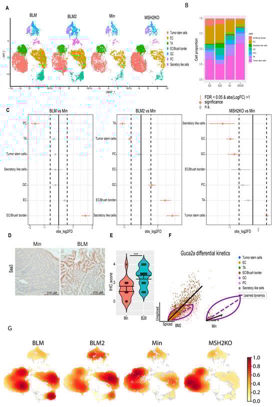 To investigate the effect of the expression of the BRAFV600E mutation or Msh2 deletion on epithelial cell composition in inflammation-induced colon tumors, we compared the proportion of cells in the different colon tumor cell populations between the different tumor types using Min tumors as a baseline (Figure 3A–C). Interestingly, BRAF mutant tumors (BLM and BLM2) were enriched for differentiated cell populations such as secretory-like cells, goblet cells, and EC/brush border cells compared to Min tumors (Figure 3C, BLM vs. Min and BLM2 vs. Min). In contrast, BRAF mutant tumors had significantly reduced tumor stem cell and TA cell populations compared to Min tumors (Figure 3C, BLM2 vs. Min). These results agree with other findings suggesting that BRAF mutation induces colon epithelial cell differentiation [45]. While Msh2 deleted tumors had a significantly increased tumor stem cell population, they had reduced differentiated cell populations such as secretory-like cells, enterocytes, and goblet cells in comparison to Min tumors (Figure 3C, MSH2KO vs. Min). Next, we compared the expression of different transcripts that are known to be specific to each lineage. In agreement with more differentiated cells in BLM tumors, BLM tumors had higher co-expression of Muc2 and Zg16 (Goblet cells), Fabp2 and Slc26a3 (enterocytes), and Saa3 and Dcn (secretory-like cells) than Min and MSH2KO tumors (Supplemental Figure S3A). Consistent with the significant increase of secretory-like cells in BLM2 (Figure 3C, BLM2 vs. Min), tumor cells in BLM tumors showed a significant increase in SAA3 protein levels compared to Min tumors by IHC (Figure 3D,E). Paneth cell markers, Lyz1 and Ang4, were co-expressed more in Min and MSH2KO tumor Paneth cells than BLM tumors (Supplemental Figure S3A), which is consistent with the smaller Paneth cell population in BLM tumors (Figure 3C, BLM vs. Min). Because Paneth cells are involved in antimicrobial activity, we were interested in the expression pattern of other antimicrobial peptides such as REG3G and GUCA2A. Interestingly, while Reg3g and Guca2a were primarily restricted to Paneth cells in Min and MSH2KO tumors, they were also expressed in enterocytes of BLM tumors (Supplemental Figure S3B). Because Guca2a was expressed in multiple lineages, we computed RNA velocity for Guca2a to calculate its differential RNA splicing kinetics allowing us to determine which lineages display RNA splicing kinetics for the Guca2a transcript in the different tumor types (see methods). We found that in BLM tumors, Guca2a exhibited high velocity (high unspliced to spliced RNA ratio) in goblet and enterocyte cells with significant differential RNA splicing kinetics in enterocytes (Fit pval kinetics = 2.29 × 10−7) (Figure 3F, BLM2). However, in Min tumors, Paneth cells and TA showed significant differential kinetics for the Guca2a transcript (Fit pval kinetics = 5.99 × 10−6) (Figure 3F, Min).