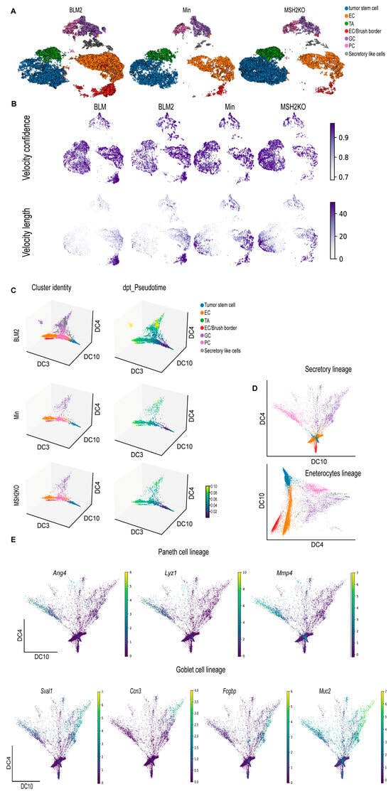 We hypothesized that the difference in tumor cellular composition among the different datasets is due to differences in colon tumor cell differentiation. To better understand colon tumor epithelial cell differentiation in the different tumor types, computational trajectory analysis was performed. For all samples, a cyclical pattern emerged representing cycling tumor stem cells and TA cells that also branched to secretory lineages and enterocytes (Figure 4A). While the BLM tumors had more cells moving toward differentiated lineages (Figure 4A, BLM2), MSH2KO tumors appeared to have more cycling tumor stem cells in comparison to Min tumors (Figure 4A, MSH2KO). Additionally, we computed velocity confidence and velocity length to predict cell directionality and differentiation speed, respectively [40]. Compared to Min tumors, BLM tumors showed more directionality toward differentiated lineages such as goblet cells, enterocytes, and brush border cells with an increased rate of differentiation at enterocytes and brush border cells (Figure 4B, BLM, and BLM2). MSH2KO tumors showed more directionality and speed toward the tumor stem cell population compared to Min tumors (Figure 4B, MSH2KO).