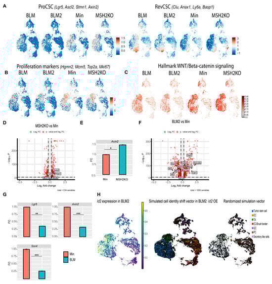 Several studies demonstrated that slow-cycling colon stem cells called revival colon stem cells (RevCSCs) are responsible for replenishing the colon after colon damage [47,48,49]. Unlike fast-cycling proliferative colon stem cells (ProCSCs), RevCSCs have high differentiation potential allowing them to repopulate the colon in response to colon damage [48]. MSH2KO and BLM tumors showed high cell density at tumor stem cell and enterocyte clusters, respectively (Figure 3G). Additionally, our data showed that the rate of differentiation in MSH2KO and BLM tumors was highest in tumor stem cell and enterocyte populations, respectively (Figure 4B). Therefore, we hypothesized that colon tumor stem cells would differ between tumor types even though all tumors are from mice on the Min background. Interestingly, the tumor stem cell population of Min and MSH2KO epithelial tumors had a larger number of cells co-expressing markers of ProCSCs (Lgr5, Ascl2, Stmn1, Axin2), compared to BLM epithelial tumors (Figure 5A). In contrast, more tumor stem cells of BLM epithelial tumors had co-expression of markers of RevCSCs (Clu, Anxa1, Ly6a, Basp1), compared to the tumor stem cell populations of Min and MSH2KO tumors (Figure 5A). Additionally, tumor stem cell and TA populations of Min and MSH2KO epithelial tumors had a larger number of cells co-expressing cell proliferation makers (Hgmn2, Mcm5, Top2a, Mki67) compared to BLM epithelial tumors (Figure 5B) consistent with the proliferative nature of ProCSCs [48]. While tumor stem cells of MSH2KO tumors showed high levels of WNT signaling pathway activity compared to Min tumors, tumor stem cells in BLM and BLM2 tumors showed low WNT signaling activity (Figure 5C). These results are consistent with ProCSCs being characterized by high WNT signaling compared to RevCSCs [48,49].