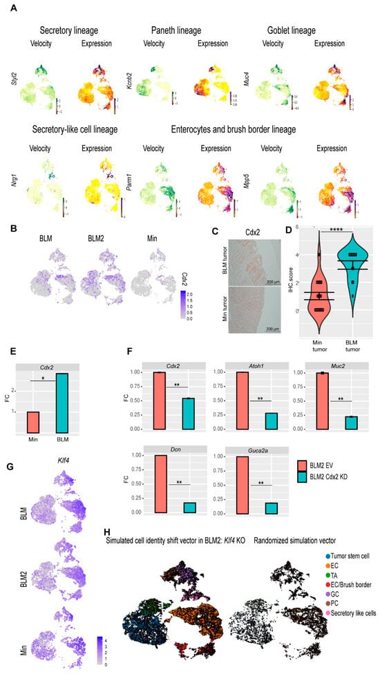 In addition to CDX2, KLF4 is another transcription factor that plays an essential role in colon epithelium differentiation [55]. Klf4 had the highest levels of expression in differentiated cells, including goblet, secretory-like cells, and enterocyte cells (Figure 6G). To test if disruption of Klf4 expression affects BLM tumor differentiation, we simulated Klf4 knockout (KO). Simulated Klf4 KO changed the directionality of differentiated cells of BLM2 tumors, shifting their direction toward the tumor stem cells (Figure 6H, compared to BLM2 in Figure 4A). This finding suggests that Klf4 expression in BLM tumors may also contribute to BLM epithelial tumor differentiation.